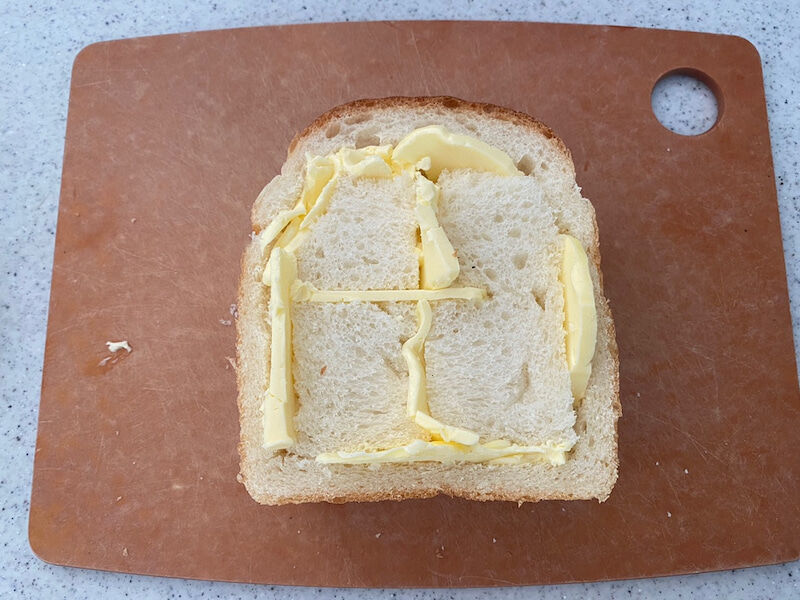 ② 食パンの内側(フチと中央)に、ナイフで底ぎりぎりまで切れ込みを入れます。